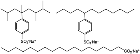 Typical anionic detergents are alkylbenzene sulfonates. The alkylbenzene portion of these anions is lipophilic and the sulfonate is hydrophilic. Two different varieties have been popularized, those with branched alkyl groups and those with linear alkyl groups. The former were largely phased out in economically advanced societies because they are poorly biodegradable.[3] An estimated 6 billion kilograms of anionic detergents are produced annually for domestic markets.