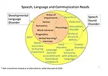 The term developmental language disorder (DLD) was endorsed in a consensus study involving a panel of experts (CATALISE Consortium) in 2017.[1] The study was conducted in response to concerns that a wide range of terminology was used in this area, with the consequence that there was poor communication, lack of public recognition, and in some cases children were denied access to services. Developmental language disorder is a subset of language disorder, which is itself a subset of the broader category of speech, language and communication needs (SLCN).