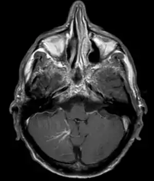 | Developmental venous anomaly in the cerebellum seen on axial contrast-enhanced T1 weighted MRI | |