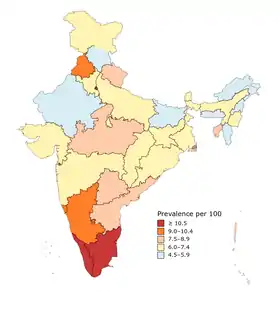 The number of people with diabetes in India has increased from 26 million in 1990 to 65 million in 2016.[1] According to the 2019 National Diabetes and Diabetic Retinopathy Survey report released by the Ministry of Health and Family Welfare, the prevalence was found to be 11.8% in people over the age of 50.[9] The prevalence of diabetes is 6.5% and prediabetes 5.7% among the adults below the age of 50 years, according to the DHS survey[10].The prevalence was similar in both male (12%) and female (11.7%) populations. It was higher in urban areas.[11] When surveyed for diabetic retinopathy, which threatens eyesight, 16.9% of the diabetic population aged up to 50 years were found to be affected. Per the report, diabetic retinopathy in the 60-69-years age group was 18.6%, in the 70-79-years age group it was 18.3%, and in those over 80 years of age it was 18.4%. A lower prevalence of 14.3% was observed in the 50-59-years age group.[9] High prevalence of diabetes is reported in economically and epidemiologically advanced states such as Tamil Nadu and Kerala, where many research institutes which conduct prevalence studies are also present.[12]