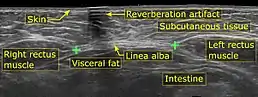 A diastasis recti may appear as a ridge running down the midline of the abdomen, anywhere from the xiphoid process to the umbilicus. It becomes more prominent with straining and may disappear when the abdominal muscles are relaxed. The medial borders of the right and left halves of the muscle may be palpated during contraction of the rectus abdominis.[5] The condition can be diagnosed by physical exam, and must be differentiated from an epigastric hernia or incisional hernia, if the patient has had abdominal surgery.[3] Hernias may be ruled out using ultrasound.[6]