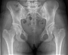 An X-ray film will show a marked gap between the pubic bones, normally there is a 4–5 mm gap but in pregnancy, hormonal influences cause relaxation of the connecting ligaments and the bones separate up to 9 mm. To demonstrate instability of the joint the patient is required to stand in the "flamingo" position, (standing with weight on one leg and the other bent).[2] A vertical displacement of more than 1 cm is an indicator of symphysis pubis instability.[3] A displacement of more than 2 cm usually indicates involvement of the sacroiliac joints.