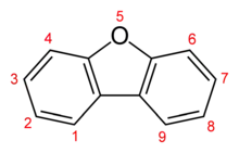Dibenzofuran is a heterocyclic organic compound with the chemical structure shown at right. It is an aromatic compound that has two benzene rings fused to a central furan ring. All the numbered carbon atoms have a hydrogen atom bonded to each of them. It is a volatile white solid that is soluble in nonpolar organic solvents. It is obtained from coal tar, where it exists as a 1% component.[1]