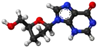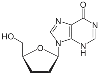 Didanosine (ddI) is a nucleoside analogue of adenosine.[9] It differs from other nucleoside analogues, because it does not have any of the regular bases, instead it has hypoxanthine attached to the sugar ring. Within the cell, ddI is phosphorylated to the active metabolite of dideoxyadenosine triphosphate, ddATP, by cellular enzymes. Like other anti-HIV nucleoside analogs, it acts as a chain terminator by incorporation and inhibits viral reverse transcriptase by competing with natural dATP.
