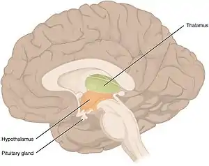| The diencephalon, which is affected by diencaphalic syndrome, consists of the thalamus, the subthalamus, the hypothalamus, and the epithalamus. | |
