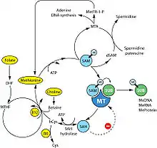 The products of these reactions are methylated DNA, RNA or proteins and S-adenosylhomocysteine (SAH). SAH has a negative feedback on its own production as an inhibitor of methyltransferase enzymes. Therefore, SAM:SAH ratio directly regulates cellular methylation, whereas levels of vitamins B6, B12, folic acid and choline regulates indirectly the methylation state via the methionine metabolism cycle.[47][48] A near ubiquitous feature of cancer is a maladaption of the methionine metabolic pathway in response to genetic or environmental conditions resulting in depletion of SAM and/or SAM-dependent methylation. Whether it is deficiency in enzymes such as methylthioadenosine phosphorylase, methionine-dependency of cancer cells, high levels of polyamine synthesis in cancer, or induction of cancer through a diet deprived of extrinsic methyl donors or enhanced in methylation inhibitors, tumor formation is strongly correlated with a decrease in levels of SAM in mice, rats and humans.[49][50]