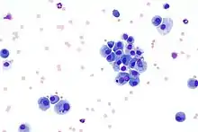 Diff-Quik is a commercial Romanowsky stain variant used to rapidly stain and differentiate a variety of pathology specimens. It is most frequently used for blood films and cytopathological smears, including fine needle aspirates.[1][2][3] The Diff-Quik procedure is based on a modification of the Wright-Giemsa stain pioneered by Harleco in the 1970s,[1] and has advantages over the routine Wright-Giemsa staining technique in that it reduces the 4-minute process into a much shorter operation and allows for selective increased eosinophilic or basophilic staining depending upon the time the smear is left in the staining solutions.[4]