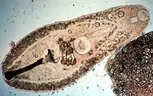 A typical digenean trematode life cycle is as follows. Eggs leave the vertebrate host in faeces and use various strategies to infect the first intermediate host, in which sexual reproduction does not occur. Digeneans may infect the first intermediate host (usually a snail) by either passive or active means. The eggs of some digeneans, for example, are (passively) eaten by snails (or, rarely, by an annelid worm),[2] in which they proceed to hatch. Alternatively, eggs may hatch in water to release an actively swimming, ciliated larva, the miracidium, which must locate and penetrate the body wall of the snail host.