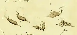 The identity of Dileptus anser is also entangled with that of another long-necked dileptid, the nominal species Dileptus cygnus (Clap. & Lach., 1859). Kahl describes and illustrates Pseudomonilicaryon anser under this name, and most studies of the organism have used this nomenclature.[1] In 1984, Dileptus cygnus was formally identified as a junior synonym of Vibrio anser (Müller, 1773).[2]