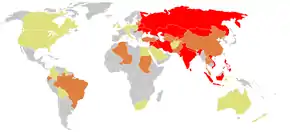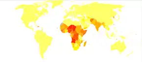 In 2015, 4,500 cases were officially reported worldwide, down from nearly 100,000 in 1980.[3] About a million cases a year are believed to have occurred before the 1980s.[2] Diphtheria currently occurs most often in sub-Saharan Africa, India, and Indonesia.[2][6] In 2015, it resulted in 2,100 deaths, down from 8,000 deaths in 1990.[4][7] In areas where it is still common, children are most affected.[2] It is rare in the developed world due to widespread vaccination but can re-emerge if vaccination rates decrease.[2][8] In the United States, 57 cases were reported between 1980 and 2004.[1] Death occurs in 5% to 10% of those diagnosed.[1] The disease was first described in the 5th century BC by Hippocrates.[1] The bacterium was identified in 1882 by Edwin Klebs.[1]