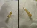 Tapeworm infection usually does not cause pathology in the dog or cat, and most pets show no adverse reaction to infection other than increased appetite. The bulk of infections are asymptomatic and the infections that do result in symptoms are generally mildly so. Pets behavior may reflect the presence of anal discomfort and itching, or pruritus. This could result in the ‘butt-scooching” across the floor, grass or carpeting. It may be accompanied by slight gastrointestinal disturbances, as this is the region where the worms inhabit. Though not a pathology of the diplydiasis, the most unnerving sign of the infection is the presence of proglottids in the animals, or child’s, feces.  These proglottids can also be found near the perianal region, in the feces, and in diapers (children). The motile proglottids can actively crawl out of the anus of the infected animal/person and migrate small distances, thus potentially covering this array of neighboring surfaces.  It is from these locations that the larval stage of the flea will come along and ingest them. Then the metacestode stage, a cysticercoid, develops in the coelomic cavity (abdominal cavity; main body cavity) of the flea larvae and remains there as the flea matures into an adult. These freshly passed proglottids are motile, allowing them to also be found on the floor and furniture, from a migration out of a pets anus and could be compared to resembling fly larvae, or maggots.[2]