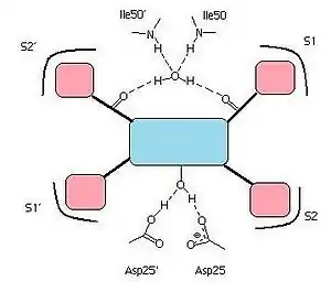 The HIV protease is a C2-symmetric homodimeric enzyme consisting of two 99 amino acid monomers. Each monomer contributes an aspartic acid residue that is essential for catalysis,[6] Asp-25 and Asp-25´. The HIV protease has the sequence Asp-Thr-Gly, which is conserved among other mammalian aspartic protease enzymes. An extended beta-sheet region on the monomers, known as the flap, constitutes in part the substrate binding site with the two aspartyl residues lying on the bottom of a hydrophobic cavity.[12][16][17] Each flexible flap contains three characteristic regions: side chains that extend outward (Met46, Phe53), hydrophobic chains extending inward (Ile47, Ile54), and a glycine rich region (Gly48, 49, 51, 52). Ile50 remains at the tip of the turn and when the enzyme is unliganded a water molecule makes hydrogen bonds to the backbone of Ile50 on each monomer.[17]
