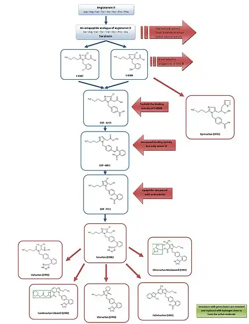 Research investigators at Takeda discovered in 1982 the weak nonpeptide Ang II antagonists S-8307 and S-8308 from a group of 1-benzylimidazole-5-acetic acid derivatives.[7] S-8307 and S-8308 have moderate potency, short duration of action and limited oral bioavailability, however they are selective and competitive AT1 receptor antagonists without partial agonist activity.[1] A group at DuPont postulated that both Ang II and the Takeda leads were bound at the same receptor site.[7] These two substances served as lead compounds for further optimization of AT1 receptor blockers.[1]