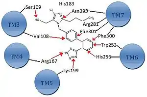 The first one is the imidazole ring that binds to amino acids in helix 7 (Asn295). The second group is the biphenyl-methyl group that binds to amino acids in both helices 6 and 7 (Phe301, Phe300, Trp253 and His256). The third one is the tetrazole group that interacts with amino acids in helices 4 and 5 (Arg167 and Lys199).