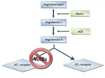 ARBs are blocking the last part of the renin–angiotensin pathway and block the pathway more specifically than ACE inhibitors.[1]