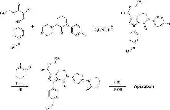 The first full synthesis of apixaban was published in 2007.[30] The key step of this reaction is a (3+2)cycloaddition of a p-methoxyphenylchlorohydrazon derivate and a p-iodophenyl-morpholin-dihydropyridin derivate. After the following elimination of HCl and morpholine, the iodine is substituted by 2-piperidinone by copper-catalization and the ethyl esther is converted to an amide (aminolysis). This reaction was registered as a patent in 2009.[31]