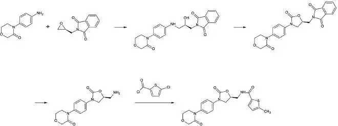 An industrial preparation of rivaroxaban was registered as a patent by Bayer Healthcare in 2005.[27] It starts from N-(4-aminophenol)-morpholinone which is alkylated by a propylene oxide derivate that also contains a primary amine involved in a phthalimide protection group. Next, a phosgene equivalent is added to form the 2-oxazolidone ring and the phthalimide is removed. The free amine can now be acylated which leads to rivaroxaban.
