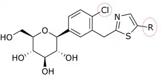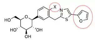 The discovery of T-1095 led to an investigation of how to enhance potency, selectivity and oral bioavailability by adding various substituents to the glycoside core. As an example we can take the change of o-glycosides to c-glycosides by creating a carbon–carbon bond between the glucose and the aglycone moiety. C-glucosides are more stable than o-glucosides which leads to modified half life and duration of action. These modifications have also led to more specificity to SGLT-2.[9] C-glucosides that have heterocyclic ring at the distal ring or proximal ring are better when it comes to anti-diabetic effect and physicochemical features all together.[3][20] C-glucoside bearing thiazole at the distal ring on canagliflozin has shown good physicochemical properties that can lead to a clinical development, but still has the same anti-diabetic activity as dapagliflozin, as shown in tables 1 and 2.