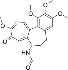 Colchicine analogues blocks cell division by disrupting the microtubule. It has been reported that the β-subunit of tubulin is involved in colchicine binding. It binds to the soluble tubulin to form colchicine-tubulin complex. This complex along with the normal tubulins then undergoes polymerization to form the microtubule. However the presence of this T-C complex prevents further polymerization of the microtubule . This complex brings about a conformational change which blocks the tubulin dimers from further addition and thereby prevents the growth of the microtubule. As the T-C complex slows down the addition of new dimers, the microtubule disassembles due to structural imbalance or instability during the metaphase of mitosis.[11]