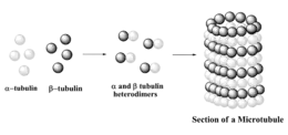 Microtubules are composed of two globular protein subunits, α- and β-tubulin. These two subunits combine to form an α,β-heterodimer which then assembles in a filamentous tube-shaped structure. The tubulin hetero-dimers arrange themselves in a head to tail manner with the α-subunit of one dimer coming in contact with the β-subunit of the other. This arrangement results in the formation of long protein fibres called protofilaments. These protofilaments form the backbone of the hollow, cylindrical microtubule which is about 25 nanometers in diameter and varies from 200 nanometers to 25 micrometers in length. About 12–13 protofilaments arrange themselves in parallel to form a C-shaped protein sheet, which then curls around to give a pipe-like structure called the microtubule. The head to tail arrangement of the hetero dimers gives polarity to the resulting microtubule, which has an α-subunit at one end and a β-subunit at the other end. The α-tubulin end has negative (–) charges while the β-tubulin end has positive (+) charges.[3] The microtubule grows from discrete assembly sites in the cells called Microtubule organizing centers (MTOCs), which are a network of microtubule associated proteins (MAP).[4][5]