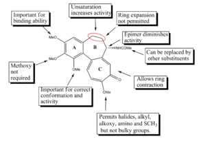 Colchicine is one of the oldest known antimitotic drugs and in the past years much research has been done in order to isolate or develop compounds having similar structure but high activity and less toxicity. This resulted in the discovery of a number of colchicine analogues. The structure of colchicine is made up of three rings, a trimethoxy benzene ring (ring A), a methoxy tropone ring (ring C) and a seven-membered ring (ring B) with an acetamido group located at its C-7 position. The trimethoxy phenyl group of colchicine not only helps in stabilizing the tubulin-colchicine complex but is also important for antitubulin activity in conjunction with the ring C. The 3-methoxy group increased the binding ability whereas the 1-methoxy group helped in attaining the correct conformation of the molecule. The stability of the tropone ring and the position of the methoxy and carbonyl group are crucial for the binding ability of the compound. The 10-methoxy group can be replaced with halogen, alkyl, alkoxy or amino groups without affecting tubulin binding affinity, while bulky substituents reduce the activity. Ring B when expanded showed reduced activity, however the ring and its C-7 side chain is thought to affect the conformation of the colchicine analogues rather than their tubulin binding ability. Substitution at C-5 resulted in loss of activity whereas attachment of annulated heterocyclic ring systems to ring B resulted in highly potent compound.[11]