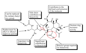 Paclitaxel has achieved great success as an anti-cancer drug, yet there has been continuous effort to improve its efficacy and develop analogues which are more active and have greater bioavailability and specificity. The importance of C-13 substituted phenylisoserine side chain to bioactivity of paclitaxel has been known for a long time. Several replacements at the C-3' substitution have been tested. Replacement of the C-3' phenyl group with alkyl or alkyneyl groups greatly enhanced the activity, and with CF3 group at that position in combination with modification of the 10-Ac with other acyl groups increased the activity several times. Another modification of C-3' with cyclopropane and epoxide moieties were also found to be potent. Most of the analogues without ring A were found to be much less active than paclitaxel itself. The analogues with amide side chain at C-13 are less active than their ester counterpart. Also deoxygenation at position 1 showed reduced activity. Preparation of 10-α-spiro epoxide and its 7-MOM ether gave compounds having comparable cytotoxicity and tubulin assembly activity as that of paclitaxel. Substitution with C-6-α-OH and C-6-β-OH gave analogues which were equipotent to paclitaxel in tubulin assembly assay. Finally the oxetane ring is found to play an important role during interaction with tubulin.[21]