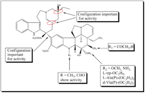 Vinblastine is a highly potent drug which also has serious side effects especially on the neurological system. Therefore, new synthetic analogues were developed with the goal of obtaining more efficient and less toxic drugs. The stereochemical configurations at C-20', C-16' and C-14' in the velbanamine portion are critical and inversion leads to loss of activity. The C-16' carboxymethyl group is important for activity since decarboxylated dimer is inactive. Structural variation at C-15'- C-20' in the velbanamine ring is well tolerated. The upper skeletal modification of vinblastine gave vinorelbine which shows comparable activity as that of vinblastine. Another analogue prepared was the difluoro derivative of vinorelbine which showed improved in vivo antitumor activity. It was discovered that fluorination at C-19' position of vinorelbine dramatically increased the in vivo activity. Most of the SAR studies involve the vindoline portion of bis-indole alkaloids because modification at C-16 and C-17 offers good opportunities for developing new analogues. The replacement of the ester group with an amide group at the C-16 resulted in the development of vindesine. Similarly replacement of the acetyl group at C-16 with L-trp-OC2H5, d-Ala(P)-(OC2H5)2, L-Ala(P)-(OC2H5)2 and I-Vla(P)-(OC2H5)2 gave rise to new analogues having anti- tubulin activity. Also it was found that the vindoline's indole methyl group is a useful position to functionalize potentially and develop new, potent vinblastine derivatives. A new series of semi-synthetic C-16 -spiro-oxazolidine-1,3-diones prepared from 17-deacetyl vinblastine showed good anti-tubulin activity and lower cytotoxicity. Vinglycinate a glycinate prodrug derived from the C-17-OH group of vinblastine showed similar antitumor activity and toxicity as that of vinblastine.[22]