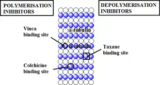 Tubulin inhibitors thus act by interfering with the dynamics of the microtubule, i.e., growing (polymerization) and shortening (depolymerization). One class of inhibitors operate by inhibiting polymerization of tubulin to form microtubules and are called polymerization inhibitors like the colchicine analogues and the vinca alkaloids. They decrease the microtubule polymer mass in the cells at high concentration and act as microtubule-destabilizing agents. The other class of inhibitors operate by inhibiting the depolymerization of polymerized tubulin and increases the microtubule polymer mass in the cells. They act as microtubule-stabilizing agents and are called depolymerization inhibitors like the paclitaxel analogues.[3] These three classes of drugs seems to operate by slightly different mechanism.