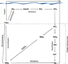 More recently, it has been discovered that using intracellular nitrate stores, diatoms can carry out dissimilatory nitrate reduction to ammonium, likely for short-term survival or for entering resting stages, thereby allowing them to persist in dark and anoxic conditions.[11][15] However, their metabolism is probably not sustained by DNRA for long-term survival during resting stages, as these resting stages often can be much longer than their intracellular nitrate supply would last.[11] The use of DNRA by diatoms is a possible explanation for how they can survive buried in dark, anoxic sediment layers on the ocean floor, without being able to carry out photosynthesis or aerobic respiration.[12] Currently, DNRA is known to be carried out by the benthic diatom Amphora coffeaeformis, as well as the pelagic diatom Thalassiosira weissflogii.[11][12] As diatoms are a significant source of oceanic primary production, the ability for diatoms to perform DNRA has major implications on their ecological role, as well as their role in the marine nitrogen cycle.[12]