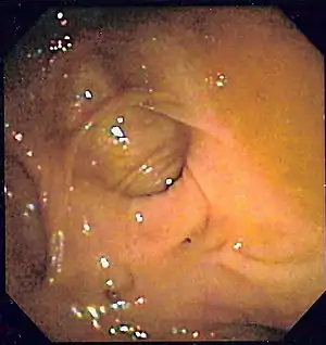 Diverticulosis is the condition of having multiple pouches (diverticula) in the colon that are not inflamed. These are outpockets of the colonic mucosa and submucosa through weaknesses of muscle layers in the colon wall,[1] and may be due in part to low-fiber diet prompting changes in intestinal microflora with consequent low-grade inflammation.[2] Diverticula don't cause symptoms in most people.[3] Diverticular disease occurs when diverticula become clinically inflamed, a condition known as diverticulitis.[4]