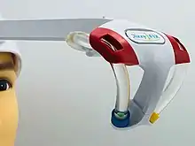 The DizzyFIX is an FDA-cleared home medical device available to assist in the treatment of benign paroxysmal positional vertigo (BPPV) and its associated vertigo.[1] The device itself is a head-worn representation of semi-circular canals. The device is filled with fluid and a particle representing the otoconia (loose hard particles) associated with BPPV. The device works like a visual set of instructions and guides the user through the treatment maneuver for BPPV. This maneuver is called the particle repositioning maneuver or Epley maneuver.