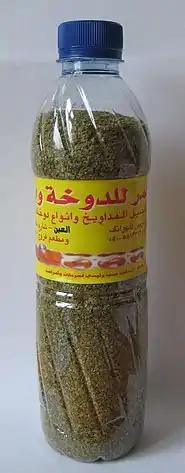 Dokha (Arabic: دوخة, "dizziness" or "vertigo") is an Arabian tobacco product, consisting of dried and finely shredded tobacco flakes mixed with herbs and spices. It originated in Iran during the 15th century.[1] Unlike hookah tobacco (also called "shisha" or "mu'assel"), dokha is not cured with molasses. Users smoke the tobacco blend in small quantities using a pipe called a midwakh. Because the midwakh pipe is used almost exclusively for smoking dokha, the terms are often used interchangeably.[2]