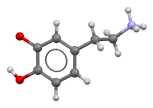 ![]() Ball-and-stick model of the zwitterionic form of dopamine found in the crystal structure[1] | |