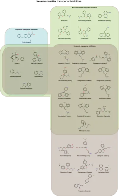 ==Pharmacotherapeutic uses== The following drugs have DRI action and have been or are used clinically specifically for this property: amineptine, dexmethylphenidate, difemetorex, fencamfamine, lefetamine, levophacetoperane, medifoxamine, mesocarb, methylphenidate, nomifensine, pipradrol, prolintane, and pyrovalerone. The following drugs are or have been used clinically and possess only weak DRI action, which may or may not be clinically-relevant: adrafinil, armodafinil, bupropion, mazindol, modafinil, nefazodone, sertraline, and sibutramine. The following drugs are or have been clinically used but only coincidentally have DRI properties: benzatropine, diphenylpyraline, etybenzatropine, ketamine, nefopam, pethidine (meperidine), and tripelennamine. The following are a selection of some particularly notably abused DRIs: cocaine, ketamine, MDPV, naphyrone, and phencyclidine (PCP). Amphetamines, including amphetamine, methamphetamine, MDMA, cathinone, methcathinone, mephedrone, and methylone, are all DRIs as well, but are distinct in that they also behave, and potentially more potently as dopamine releasing agents (DRAs) (due to Yerkes–Dodson's law, 'more potently stimulated' may not equal more optimally functionally stimulated). There are very distinct differences in the mode of action between dopamine releasers/substrates & dopamine re-uptake inhibitors; the former are functionally entropy-driven (i.e. relating to hydrophobicity) and the latter are enthalpy-driven (i.e. relating conformational change).[3][4] Reuptake inhibitors such as cocaine induce hyperpolarization of cloned human DAT upon oocytes that are naturally found on neurons, whereas releasing agents induce de-polarization of the neuron membrane.[5][6]