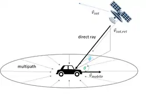 ![]() Geometry for Doppler effects. Variables: is the velocity of the mobile station, is the velocity of the satellite, is the relative speed of the satellite, is the elevation angle of the satellite and is the driving direction with respect to the satellite. |