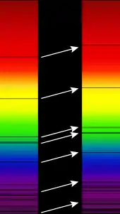 The use of the Doppler effect for light in astronomy depends on our knowledge that the spectra of stars are not homogeneous. They exhibit absorption lines at well defined frequencies that are correlated with the energies required to excite electrons in various elements from one level to another. The Doppler effect is recognizable in the fact that the absorption lines are not always at the frequencies that are obtained from the spectrum of a stationary light source. Since blue light has a higher frequency than red light, the spectral lines of an approaching astronomical light source exhibit a blueshift and those of a receding astronomical light source exhibit a redshift.
