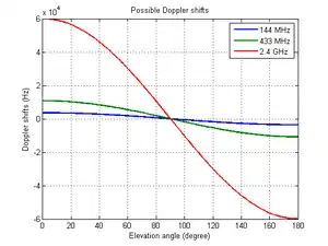 ![]() Possible Doppler shifts in dependence of the elevation angle (LEO: orbit altitude = 750 km). Fixed ground station.[19] |