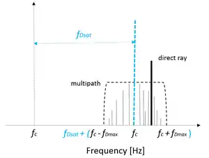 ![]() Doppler effect on the mobile channel. Variables: is the carrier frequency, is the maximum Doppler shift due to the mobile station moving (see Doppler Spread) and is the additional Doppler shift due to the satellite moving. |