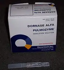 Dornase alfa (proprietary name Pulmozyme from Genentech) is a highly purified solution of recombinant human deoxyribonuclease I (rhDNase), an enzyme which selectively cleaves DNA. Dornase alfa hydrolyzes the DNA present in sputum/mucus of cystic fibrosis patients and reduces viscosity in the lungs, promoting improved clearance of secretions. This protein therapeutic agent is produced in Chinese hamster ovary cells.