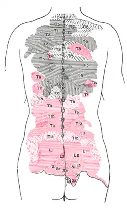 ![]() Areas of distribution of the cutaneous branches of the posterior divisions of the spinal nerves. The areas of the medial branches are in black, those of the lateral in red. | |