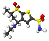 Dorzolamide, sold under the brand name Trusopt among others, is a medication used to treat high pressure inside the eye including glaucoma.[1] It is used as an eye drop.[1] Effects begin within three hours and lasts for at least eight hours.[1] It is also available as the combination dorzolamide/timolol.[1]