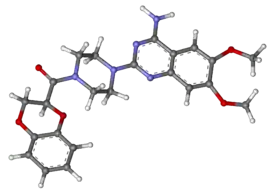 Common side effects include dizziness, sleepiness, swelling, nausea, shortness of breath, and abdominal pain.[1] Severe side effects may include low blood pressure with standing, an irregular heart beat, and priapism.[1][2] Prostate cancer should be ruled out before starting treatment.[1] It is a α1-selective adrenergic blocker in the quinazoline class of compounds.[1]