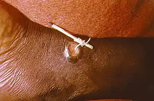 There is no vaccine or medicine to treat or prevent Guinea worm disease.[19] Untreated cases can lead to secondary infections, disability and amputations.[25] Once a Guinea worm begins emerging, the first step is to do a controlled submersion of the affected area in a bucket of water. This causes the worm to discharge many of its larvae, making it less infectious. The water is then discarded on the ground far away from any water source. Submersion results in subjective relief of the burning sensation and makes subsequent extraction of the worm easier. To extract the worm, a person must wrap the live worm around a piece of gauze or a stick. The process may take several weeks.[5] Gently massaging the area around the blister can help loosen the worm.[10] This is nearly the same treatment that is noted in the famous ancient Egyptian medical text, the Ebers papyrus from c. 1550 BC.[11] Some people have said that extracting a Guinea worm feels as if the afflicted area is on fire.[27][28] However, if the infection is identified before an ulcer forms, the worm can also be surgically removed by a trained doctor in a medical facility.[22]
