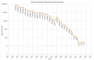 In 2019, 54 cases were reported across 4 countries.[4][3] This is down from an estimated 3.5 million cases in 1986.[5] In 2016 the disease occurred in three countries, all in Africa, down from 20 countries in the 1980s.[1][9] It will likely be the first parasitic disease to be globally eradicated.[10] Guinea worm disease has been known since ancient times.[5] The method of removing the worm is described in the Egyptian medical Ebers Papyrus, dating from 1550 BC.[11] The name dracunculiasis is derived from the Latin "affliction with little dragons",[12] while the name "guinea worm" appeared after Europeans saw the disease on the Guinea coast of West Africa in the 17th century.[11] Other Dracunculus species are known to infect various mammals, but do not appear to infect humans.[13][14] Dracunculiasis is classified as a neglected tropical disease.[15] Because dogs may also become infected,[16] the eradication program is monitoring and treating dogs as well.[17]