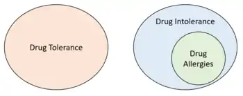 Drug intolerance or drug sensitivity refers to an inability to tolerate the adverse effects of a medication, generally at therapeutic or subtherapeutic doses. Conversely, a patient is said to be "tolerating" a drug when they can tolerate its adverse effects. It is not to be confused with a drug allergy, which is a form of drug intolerance, but requires an immune-mediated component. It is also not to be confused with drug tolerance ("drug resistance," or tachyphylaxis) which refers to a lack of adverse effects even at higher than average doses. Some instances of drug intolerance are known to result from genetic variations in drug metabolism.