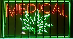 On November 5, 1996, 56% of voters approved Proposition 215 (also known as the Compassionate Use Act of 1996), taking effect the following day and removing state-level criminal penalties on the use, possession, and cultivation of marijuana by patients that "would benefit from medical marijuana" and possess a "written or oral recommendation" from their physician.[8] Conditions typically covered by the law include arthritis, cachexia, cancer, chronic pain, HIV or AIDS, epilepsy, migraines, and multiple sclerosis. Initially, there existed no set limits regarding the amount of marijuana patients could possess or cultivate.[8] California Senate Bill 420, also known as the Medical Marijuana Program Act,[9] was signed into law in October 2003 and took effect on January 1, 2004, establishing the amount of medicinal marijuana patients and/or their caregivers may grow and possess. The bill allowed for no more than 8 ounces of dried marijuana and/or 6 mature (or 12 immature) plants, unless larger quantities were recommended by a physician.[8] Senate Bill 420 also required the California Department of State Health Services to establish a voluntary patient registry and issue identification cards to patients, though no such registry has been established to date.[8]