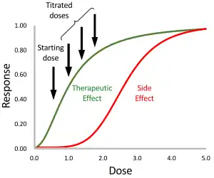 When a drug has a narrow therapeutic index, titration is especially important, because the range between the dose at which a drug is effective and the dose at which side effects occur is small.[2] Some examples of the types of drugs commonly requiring titration include insulin, anticonvulsants, blood thinners, anti-depressants, and sedatives.[3][4][5]