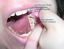 | Alveolar osteitis of a socket after tooth extraction of all maxillary teeth; note lack of blood clot in socket and exposed alveolar bone | |