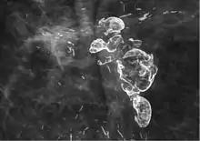 Detail of a mammography showing liponecrosis (round/oval calcifications) and plasma cell mastitis with typical rod-like calcifications