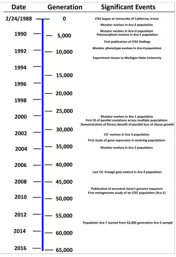 - "Overview of the E. coli long-term evolution experiment". myxo.css.msu.edu. Retrieved 2016-05-28.